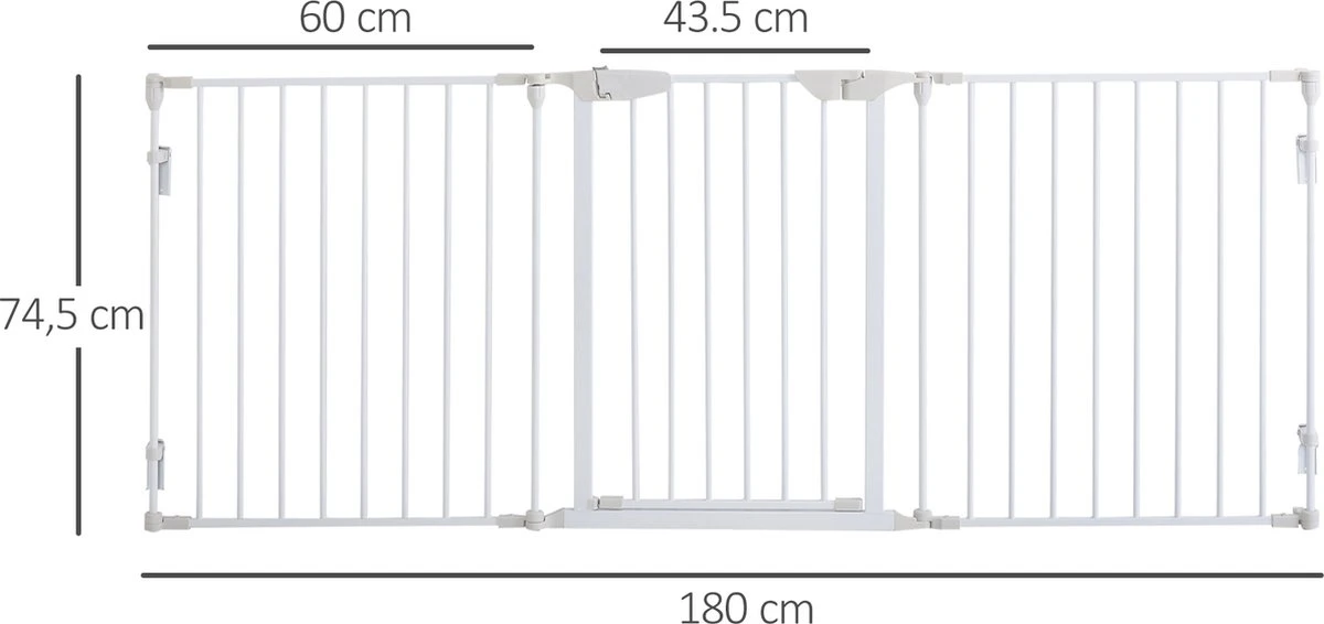 Dit hondenhek van PawHut is ontworpen om een veilige en comfortabele ruimte te creëren voor je dierbare harige vrienden. Het kan worden gebruikt als dierenbox, veiligheidshek, afscheiding voor de kachel en de kerstboom, en zelfs als scheidingswand. Dankzij het inklapbare design kan het hek gemakkelijk worden vervoerd en opgeborgen als het niet wordt gebruikt. Geef je huisdier een thuis met deze box! Eigenschappen: · Kan aan de muur worden gemonteerd met behulp van de meegeleverde accessoires · Kan worden gebruikt als kinderbox, veiligheidshek, afscherming van kerstboom, en kachel, of worden ingezet als scheidingswand, etc. · Het hek sluit automatisch als de openingshoek kleiner is dan 90° en blijft open als deze groter is dan 90° (het hek sluit niet als de hoek kleiner is dan 15°) · Dit veiligheidshek voor dieren kan in elke gewenste vorm worden gezet in een L-vorm, U-vorm, etc. · Trek de knop terug en til hem op om de deur te openen · Sterk metalen frame met gepoedercoat oppervlak, niet giftig, duurzaam, gaat jarenlang mee · Inklapbaar design voor eenvoudig opbergen en vervoeren · Geschikt voor kleine en middelgrote honden Technische gegevens: · Kleur: Wit · Materiaal: Metaal, kunststof · Afmetingen volledig uitgeklapt: 180 L x 3 B x 74,5 H cm · Afmetingen opgevouwen: 60 L x 7 B x 74,5 H cm · Afmetingen per paneel: 60 L x 3 B x 74,5 H cm · Afstand van de hekken: 5,8 cm · Aantal panelen: 3 · Omvang van de levering: 1 x Deurafscherming · Verzendbriefje: Geen verzending naar Nederlandse eilanden.