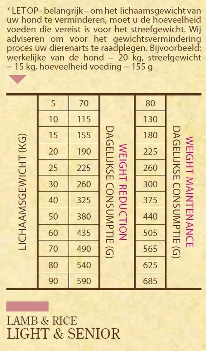 | Voedingswaarde | : 13 kg. Smaak: Lam&Rijst. Lam, rijst, aardappel, gevogeltevet (geconserveerd met gemengde tocoferolen, een bron van vitamine E) zalm olie, natuurlijke smaakstoffen, gedroogde appels, biergist, tomaten, yucca schidigera extract, wortelen, mineralen, DLmethionine, l-lysine, mannan-oligosachariden, fructo-oligosachariden, probiotica. |